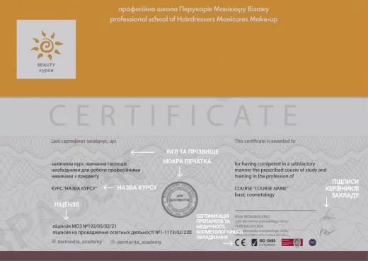 8 занять + 1 практичний семінар «Як ефективно рекламуватися beauty спеціалісту» від маркетолога (В ліцензованій професійній школі Ви можете скористатися проєктом ОПЛАТА ЧАСТИНАМИ).