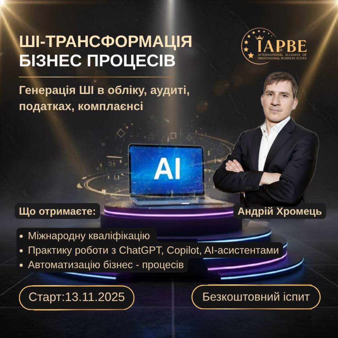 Міжнародна програма "ШІ-Трансформація Бізнес-процесів", кваліфікація "Експерт із застосування ШІ-технологій у фінансово-економічних процесах" Спеціалізація:  Автоматизація та оптимізація фінансово-економічної діяльності за допомогою ШІ, від Міжнародного Альянсу Професійної Бізнес-еліти - IAPBE