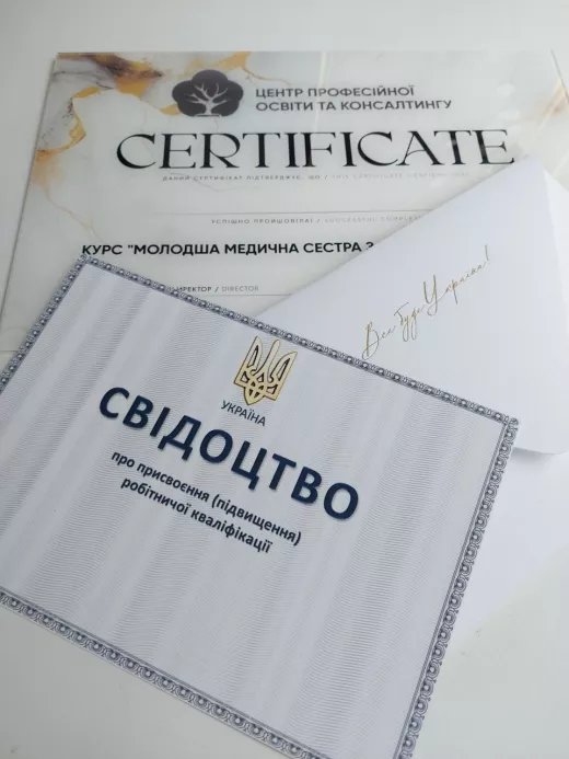 Після закінчення курсу ви отримаєте свідоцтво державного зразка та сертифікат. Наша програма навчання "Молодша медична сестра з догляду за хворими" ліцензована Міністерством освіти і науки України, тому наше свідоцтво визнається у медичних державних установах та підходить для роботи у даній професії.