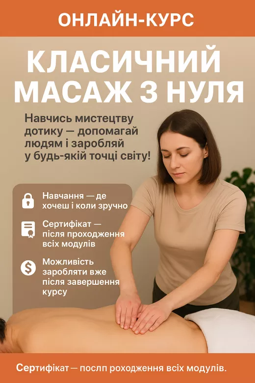 Онлайн-курс «Класичний масаж з нуля». Навчись мистецтва дотику — допомагай людям і заробляй у будь-якій точці світу!