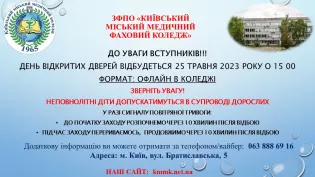 Запрошуємо на День відкритих дверей в Київському міському медичному фаховому коледжі, що відбудеться 25.05.2023 о 15:00 в коледжі.